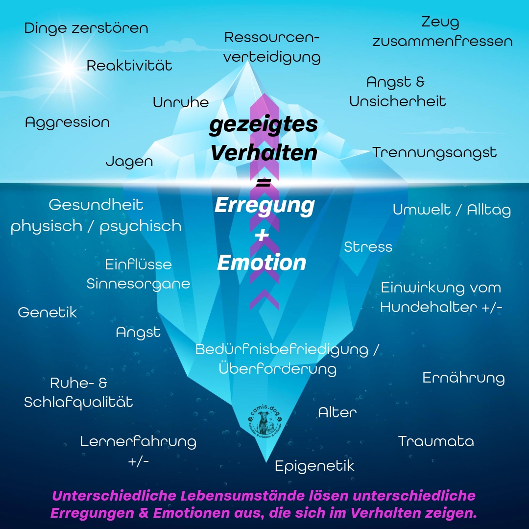 Unterhalb der Wasseroberfläche, also hinter dem gezeigten Verhalten, liegt beim Hund eine ganze Welt von Einflüssen und die eigentliche Komplexität.